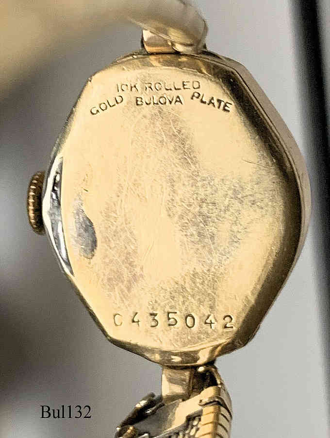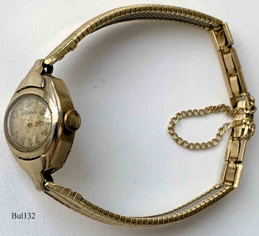 A Bulova Handwinding watch, model “Diamond Excellency”, with gold plated decorated case, signed front: “Bulova”, back: “Bulova, 10K Rolled Gold Plate, 0435042”, inside: “Bulova Watch Co, 6AH, seventeen 17 Jewels, unadjusted, Swiss”, Caliber 6AH, production date appr. 1940, gold filled back, gold plated band with security clasp.