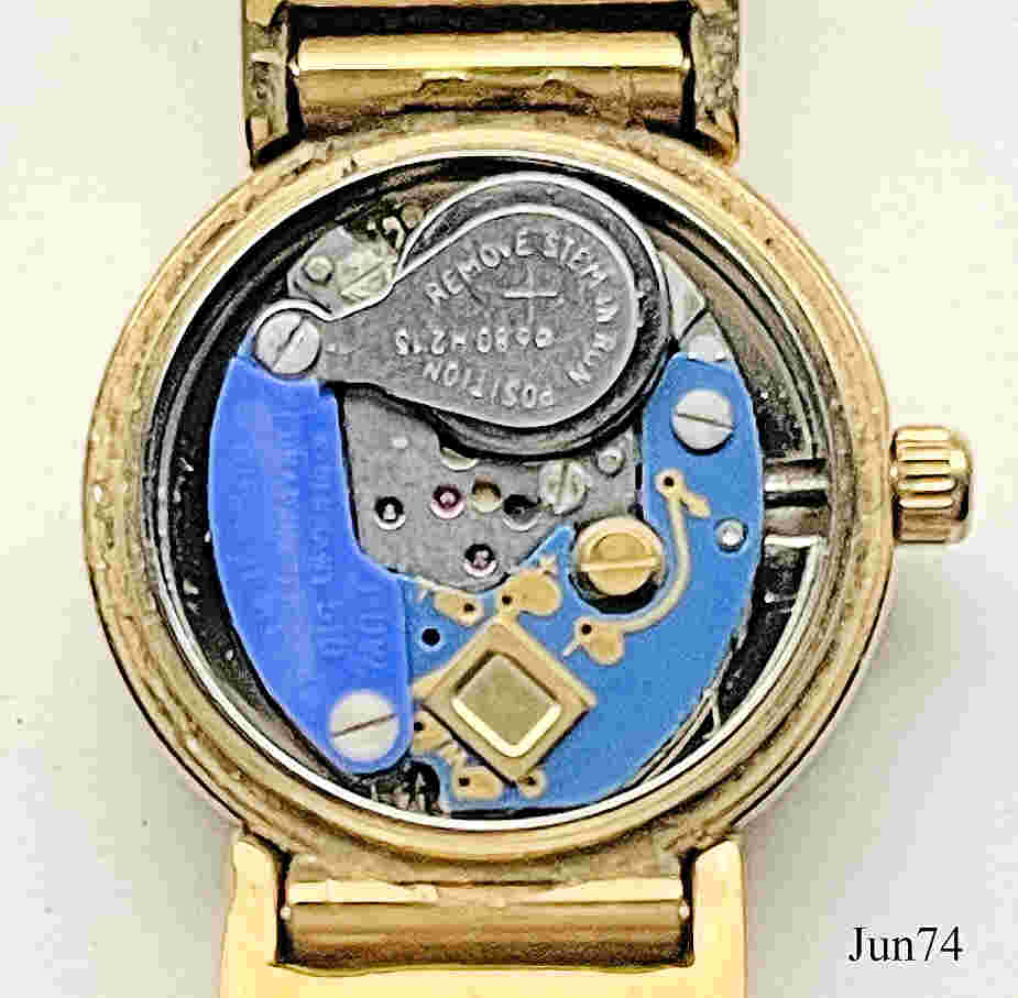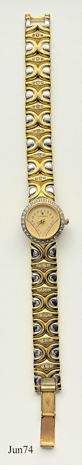 Eine Junghans Damen Schmuckuhr mit Zirkonen besetzt auf dem Zifferblatt und um den Außenrand. Dazu ein kunstvoll gearbeitetes Silber/Goldfarbiges Metallarmband. Beschriftet vorn: “Junghans”, hinten: “Base Metal Bezel, Stainless Steel Back, Water Resistant 30 M, Quartz, 47 5961”, innen: “PUW, W.Germany, 510, Unadjusted, Four 4 Jewels”