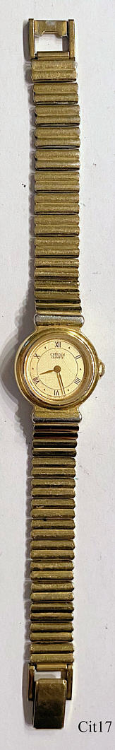Dies ist eine Citizen Damen Quartz Uhr mit dem 3220A Werk. Beschriftet vorn: ”Citizen, Quartz”, hinten: ”Citizen Watch Co., Water Resist, Base Metal YP, 3220-S60554 SMW, 7094118, GN-4-S-> 5”, innen: “Citizen, Watch Co., One 1 Jewel, Japan, Unadjusted, 3220A, 280-94”. Vergoldetes Glieder Armband.