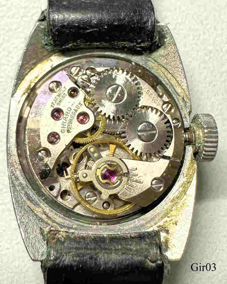 Eine sehr zierliche Girard-Perregaux Damen Handaufzugsuhr im Edelstahl Gehäuse. Blaues Zifferblatt, Beschriftung vorn: “Girard-, Perregaux, -Swiss-”, hinten: “9139 FA”,innen: “650167, 17 Jewels, Swiss, Girard- Perregaux”, inside back: “Stainless steel, Girard-Perregaux, 1791, Swiss, GP Logo”. Schwarzes Lederarmband mit GP Schließe. Uhrwerk GP Z81