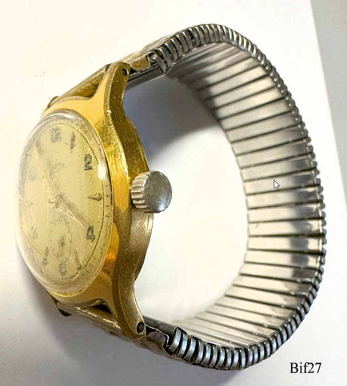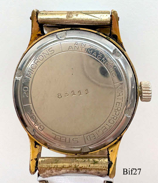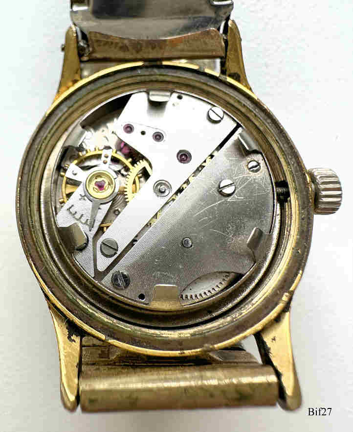 Dies ist eine Bifora Damen Handaufzugs Uhr mit dem Bifora 934 Werk, kleine Sekunde bei der 6, Gehäuse 20 Microns vergoldet. Beschriftet vorn: ”BIFORA, 17 Rubies, Shockproof”, hinten: ”Antichoc, Antimagnetic, Water Protected, Steel Back, 20 Microns, 83111”, innen: “B, 934”. Kaliber: Bifora 934, FixoFlex Band.