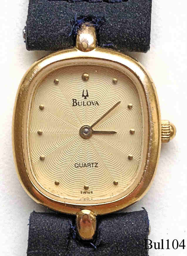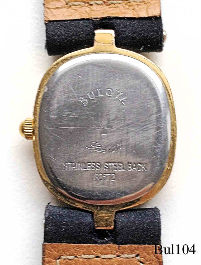 A very modern Bulova Ladies Quartzwatch with a nicely decorated creme coloured dial, golden dots instead of numbers. Signed front: “Bulova, Quartz, Swiss”, back: ”BULOVA, since 1875, Stainless Steel Back, 62572”, inside:”One (1) Jewel, 902.005, Swiss Parts, Thailand Movement”, no date of production, black Leather band mounted in the middle.