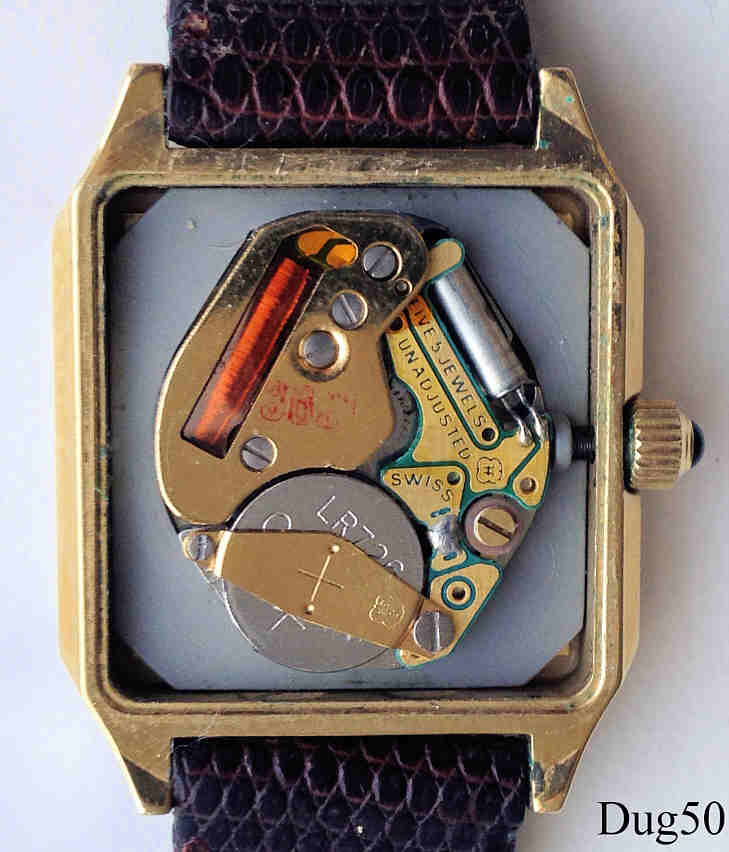 A Dugena ladies dresswatch with gold plated case and Stainless Steel Back. Caliber ETA 961.001. Signed front: “Dugena, Quartz” back: ”Showerproof, Stainless Steel Back, 51075, 512”, inside: ”Five 5 Jewels, Unadjusted, Swiss, ESA, 961.001”.