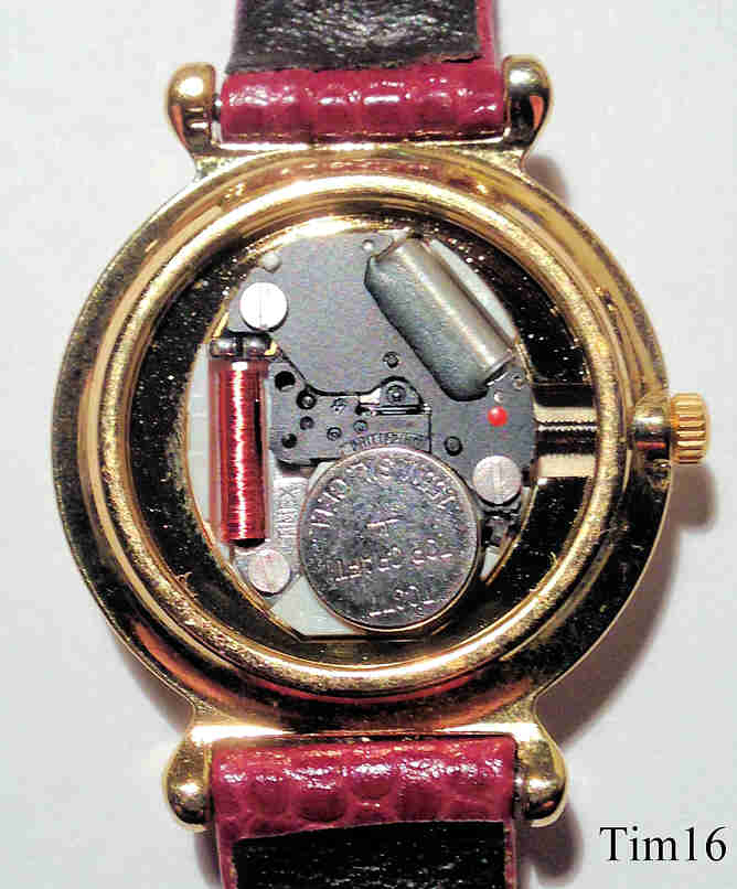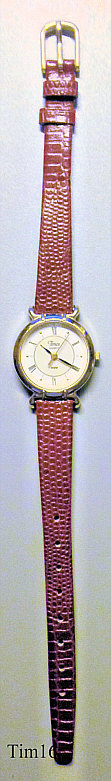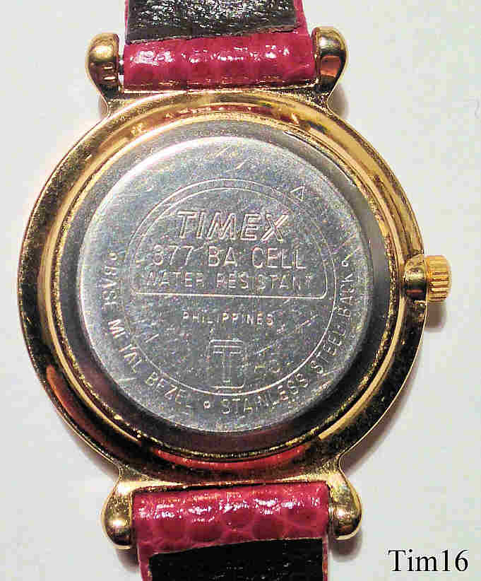 Dies ist eine Timex Damen Quartzuhr mit weißem Zifferblatt. Beschriftet vorn: “Timex, Quartz”, hinten: “Timex 377 BA Cell, Water Resistant, Phillippines, T, A5, Base Metal Bezel, Stainless Steel Back”, innen: “ Timex, Phillippines, No Jewels, Unadjusted, B35”. Kaliber B35