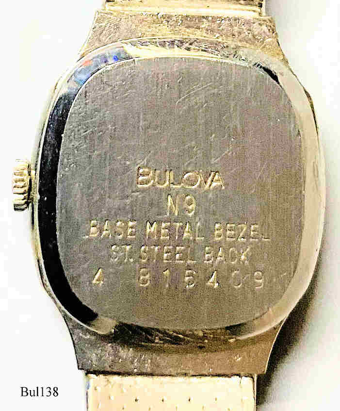 Eine Bulova Damen Quartzuhr mit schwarzem Zifferblatt, Beschriftet vorne: ”Bulova, Quartz”, hinten: “BULOVA, N9, Base Metal Bezel, St.Steel Back, 4 815409”, innen: ”Unadjusted, Eight 8 Jewels, Bulova, N9, 2650.10”, Werk Bulova 2650.10, integriertes Metallarmband, Gehäuse # 8331-1