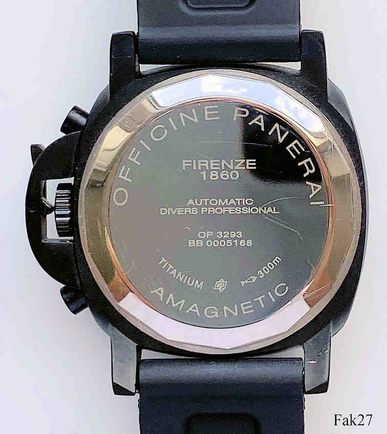 This is the copy of a Panerai Luminor, whith working chronographs. Inside a Sunon PE70 movement. Signed front: “€Luminor, Panerai, Daylight, Swiss Made”, back: “Officine Panerai, Firenze, 1860, Automatic, Divers Professional, OP3293, BB0005168, Titanium, 300m, Amagnetic”, inside: “Sunon, Model PE70, No 0 Jewels”. Black rubber band.