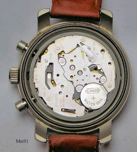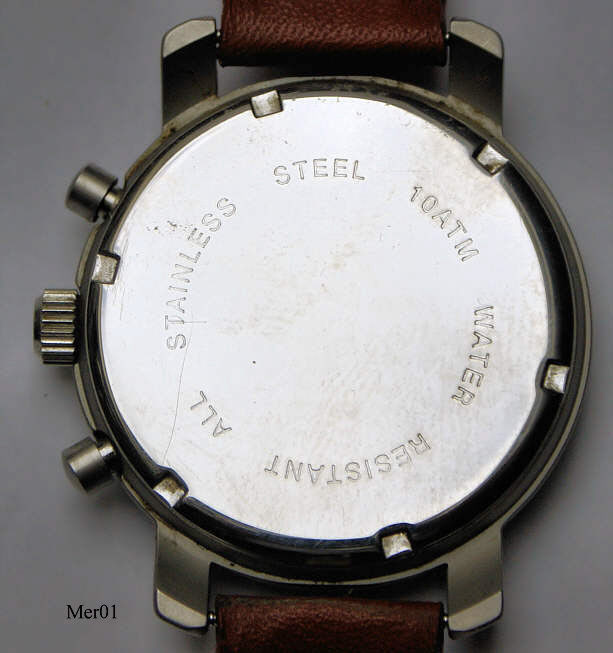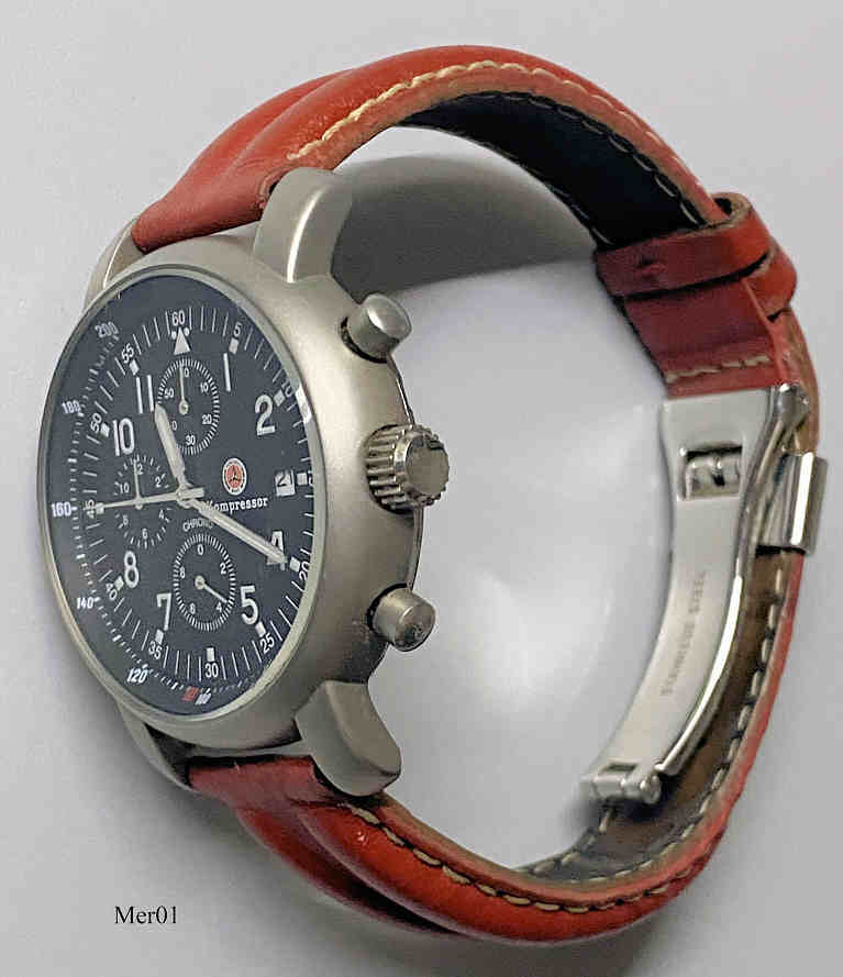 Ein Chronograph aus der Mercedes SLK Kollektion mit verschraubter Krone. Beschriftet: “Kompressor, Chrono”, hinten: ”All Stainless Steel, 10 ATM, Water Resistant”, innen: “Miyota Co., 0S60, No Jewels, Japan”. Das Werk ist ein Miyota Kaliber 0S60. Die Uhr ist ein Geschenk meiner Mitarbeiter zum Abschied aus der IBM PSD