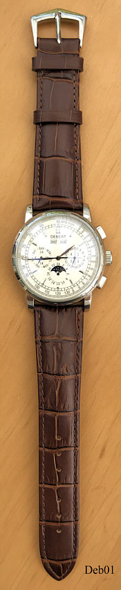 This Debert Automatic watch looks like a chronograph, but has only an extreme caledar display. The Case is made from stainless steel with 42 mm diameter. Inside is a normal automatic movement from Seagull. Model P9238, Signed front: “Debert”, back: “Water Resistant, Stainless, Automatic”, no indication inside. In the dial it shows on top the year, the month, left the day, right the date, down the 24 hours diaplay anun or moon, Brown leather band