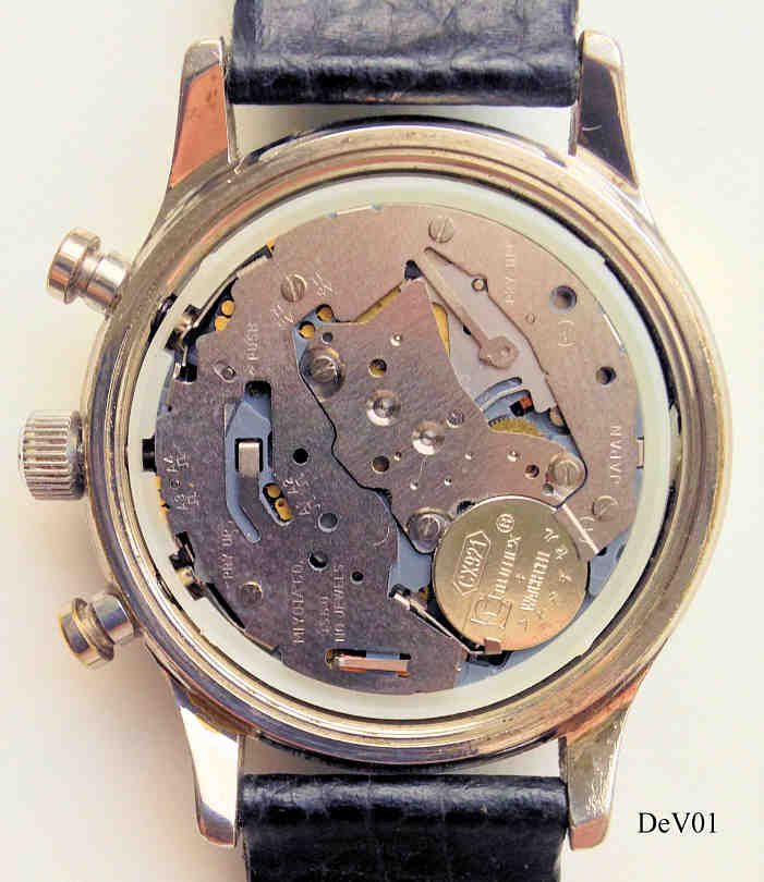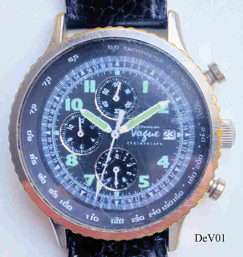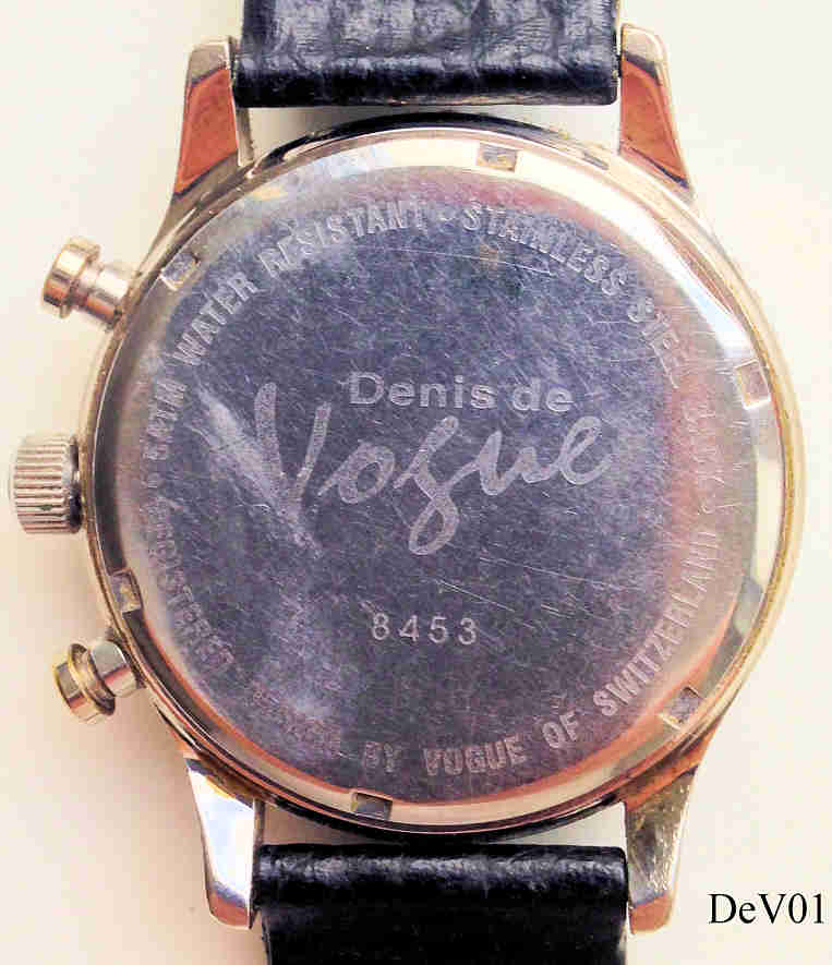 Ein Denis De Vogue Quartz Chronograph mit drei schwarzen “Augen”. Kalender bei der 3, schwarzes Zifferblatt mit Leuchtziffern. Werk Miyota Kaliber 0S60. Beschriftet vorn “Dennis de Vogue, Chronograph”, Hinten: ”Denis De Vogue, 8453, 5 ATM Water Resistant, Stainless Steel Back, Registered Design by Vogue of Switzerland”, innen: “Miyota Co., 0S60, No Jewels, Japan”. Schwarzes Lederarmband.