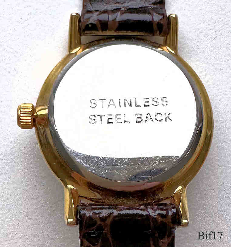 This is a Bifora ladies quartz watch, using a PUW 900E movement and a brown croc leather band. Gold plated case, gold ring around the minute circle of small crystal points, no central seconds hand. Signed front: ” BIFORA, Quartz”, back: ”Stainless Steel Back ”, inside: “Unadjusted, PUW 900E, six (6) Jewels”. Brown lizard leather band.