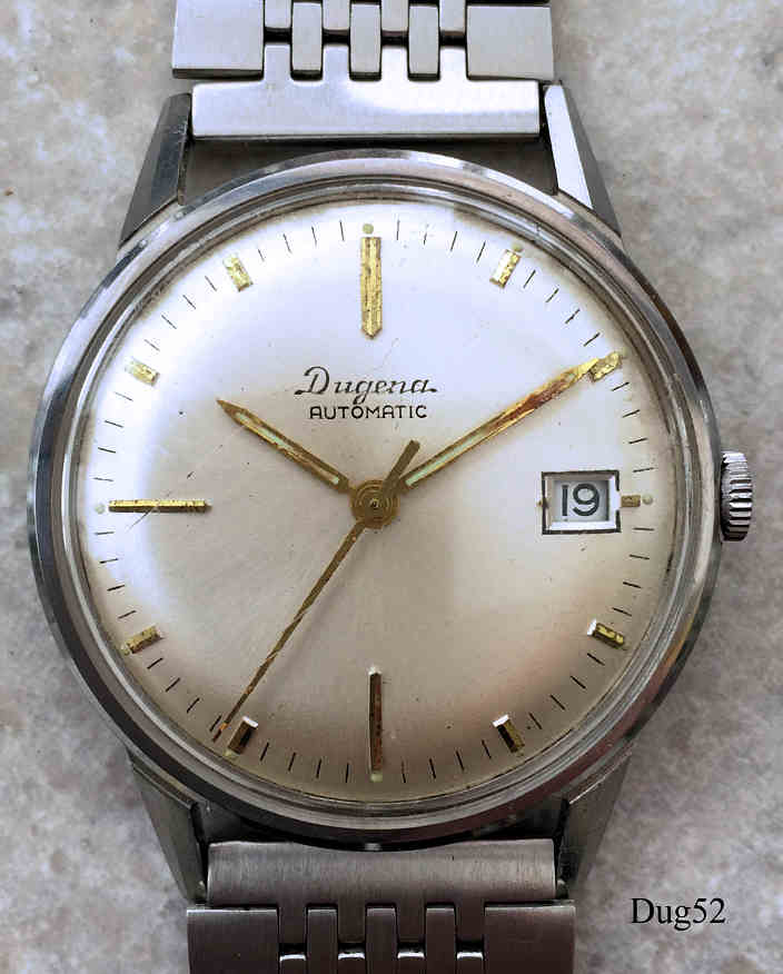 Dies ist eine Dugena Automatic Uhr. Sie hat ein normales Automaticwerk mit Datum bei der 3. Beschriftet vorn: ”Dugena, Automatic”, hinten: “Antichoc, Water Protected, Stainless Steel, Dugena, Securing”, innen: “Dugena 1043, 25 Jewels, 722”, Kaliber Otero 772. Edelstahl Gliederband.