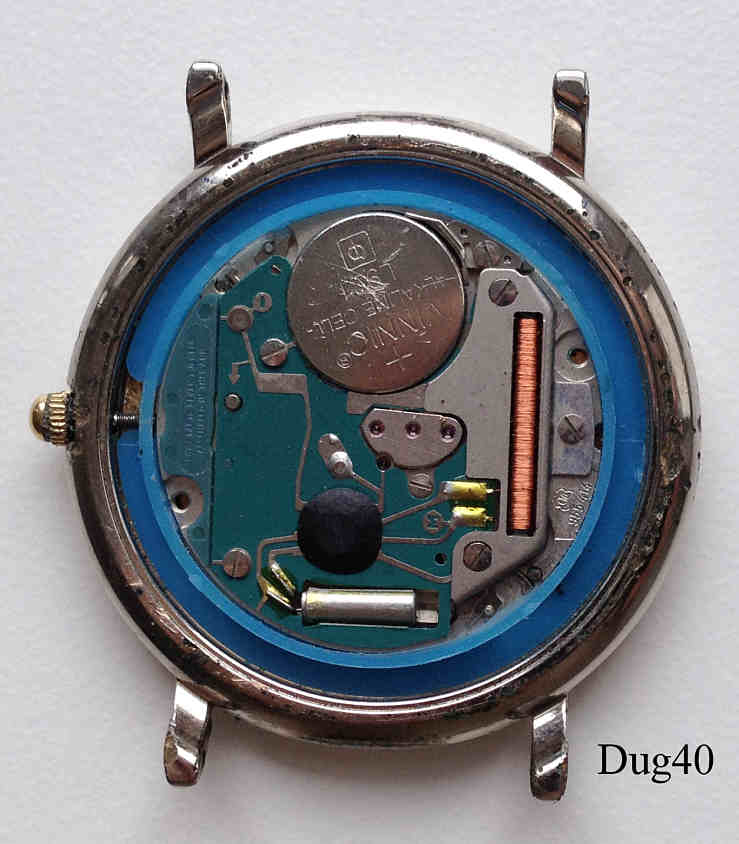 A Dugena mens watch with white dial and small Gold rim, Calendar at 3, base metal case. Signed front: “Dugena, Quartz”, back: ”Waterresistant, Stainless Steel back, 1145762, 1907, 955 414”, inside: ”Swiss Parts, seven 7 Jewels, Assembled in Thailand, ETA 955,414” |