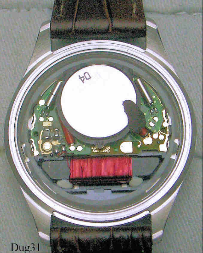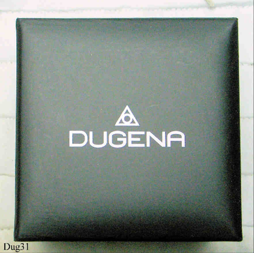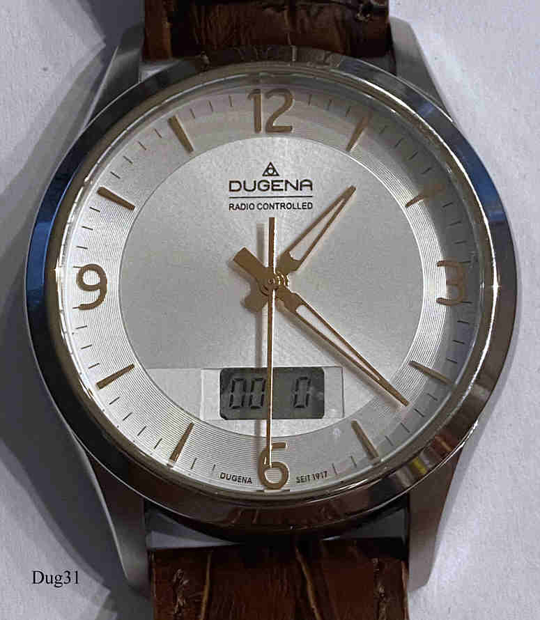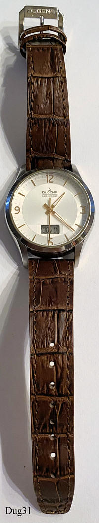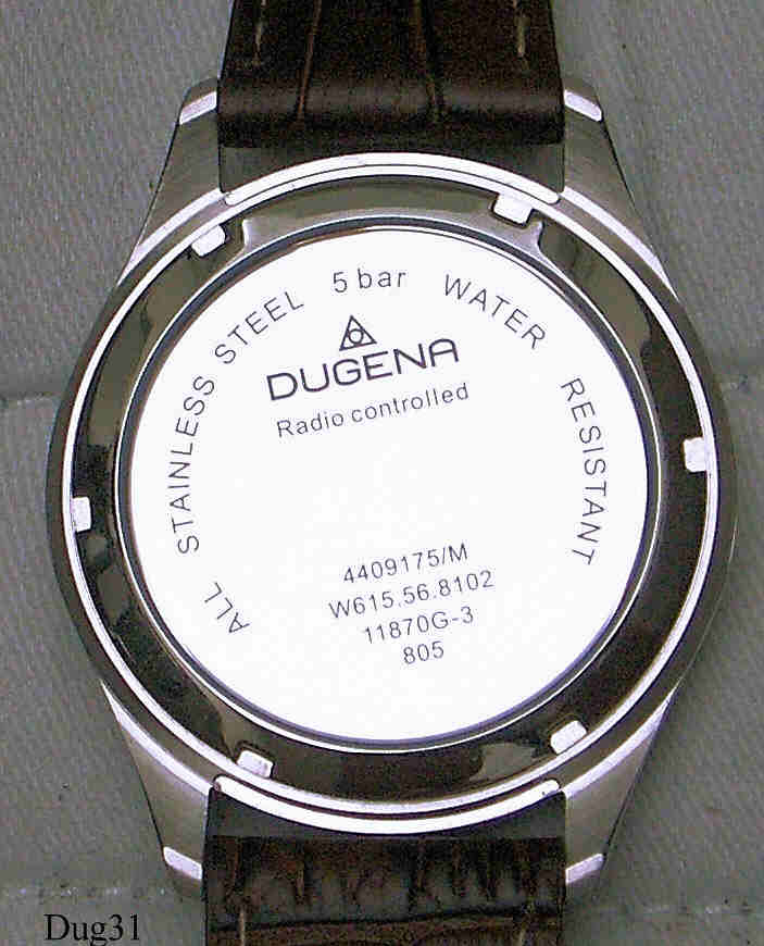 Eine Dugena Herren Funkuhr mit Stahlgehäuse und Stainless Steel Back. Beschriftung vorn: “Dugena, Radio Controlled”, Hinten: ”All Stainless Steel, 5 Bar Water Resistant, Dugena, Radio Controlled, 4409175/M, W615.56.8102, 11870G-3, 805”, innen: ”Germany, (0) Jewels”. Braunes Leder Armband mit Dugena Schließe.