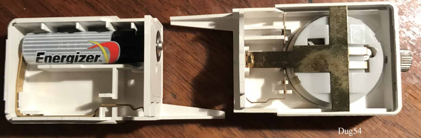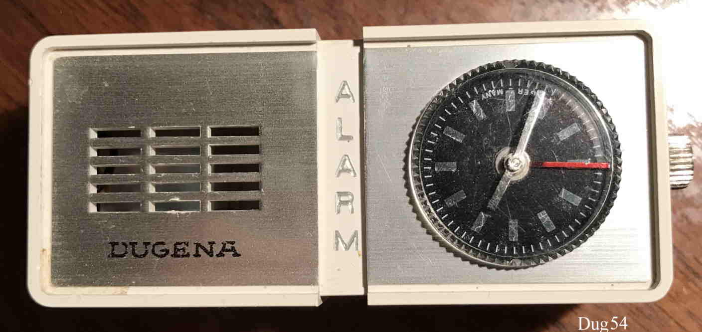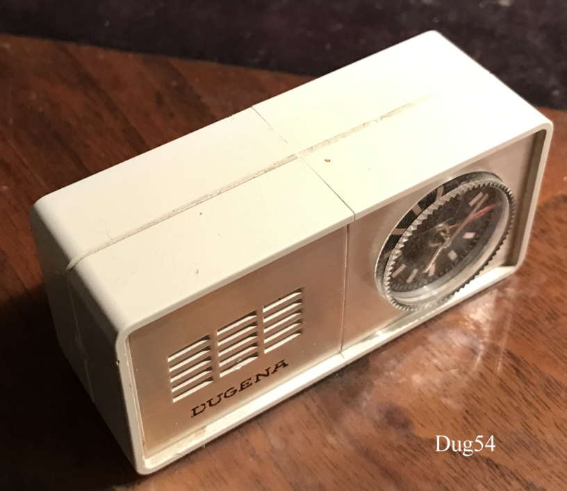 A Dugena Travel Alarm clock.black dial. Signed front: “Dugena”. The alarm is activated by moving the two halves out, turning the glas adjusts the alarm time, the crown at the right side adjusts the time. Power is supplied by an AAA battery, a piezo speaker behind the slits supplies the alarm signal. The clock measures 7x3,3x3,5 cm |