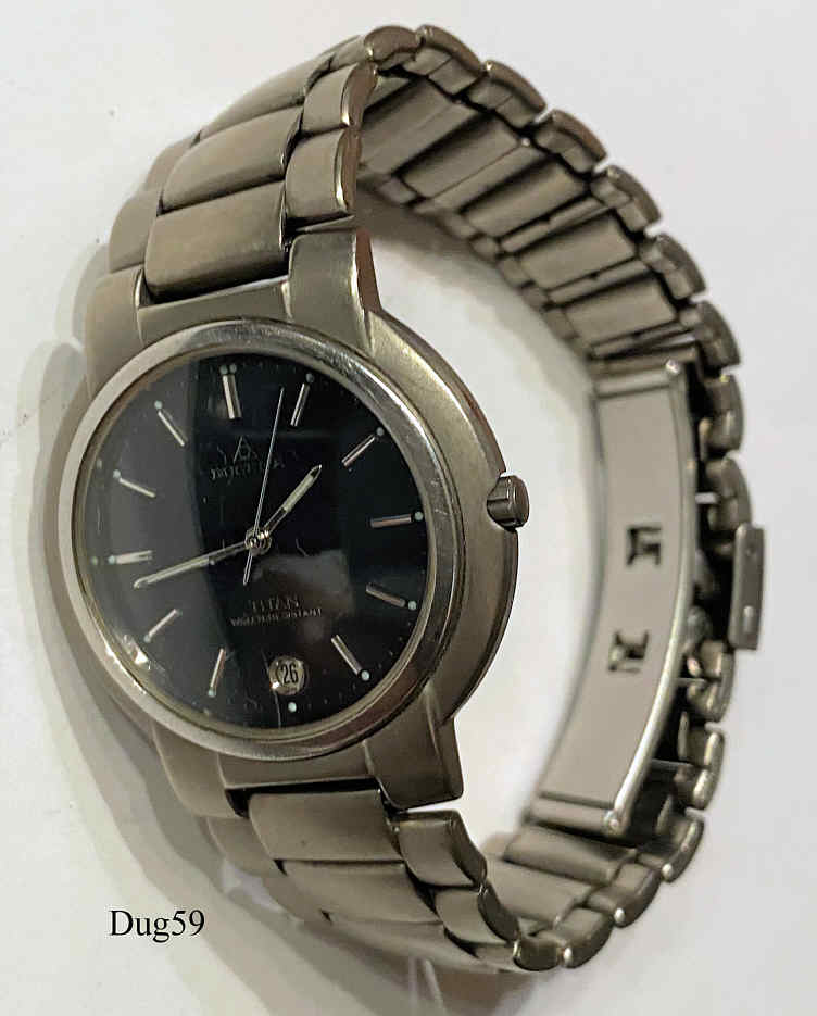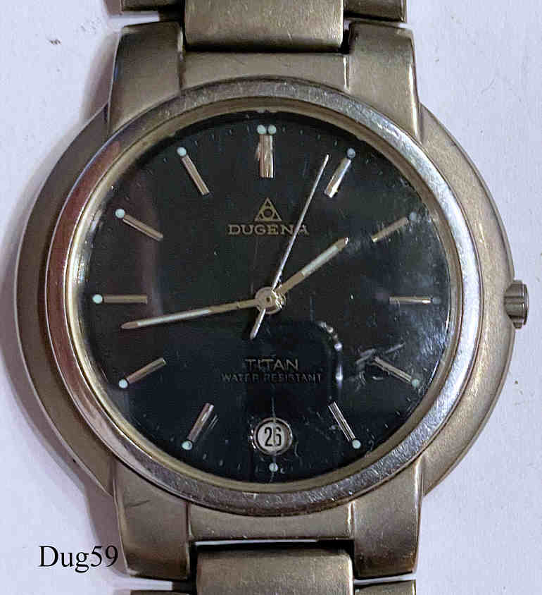 Eine Dugena Herren Quartzuhr mit Titan Gehäuse und Band, Datum bei der 6. Caliber Miyota 4U10. Beschriftung vorn: “Dugena, Titan, Water Resistant”, Hinten: ”Water Resistant, 100M, Titan, 844309, 42,Cal 4U10”, innen: ”Miyota, one 1 Jewel, Unadjusted”. Titan Armband mit Dugena Faltschließe.