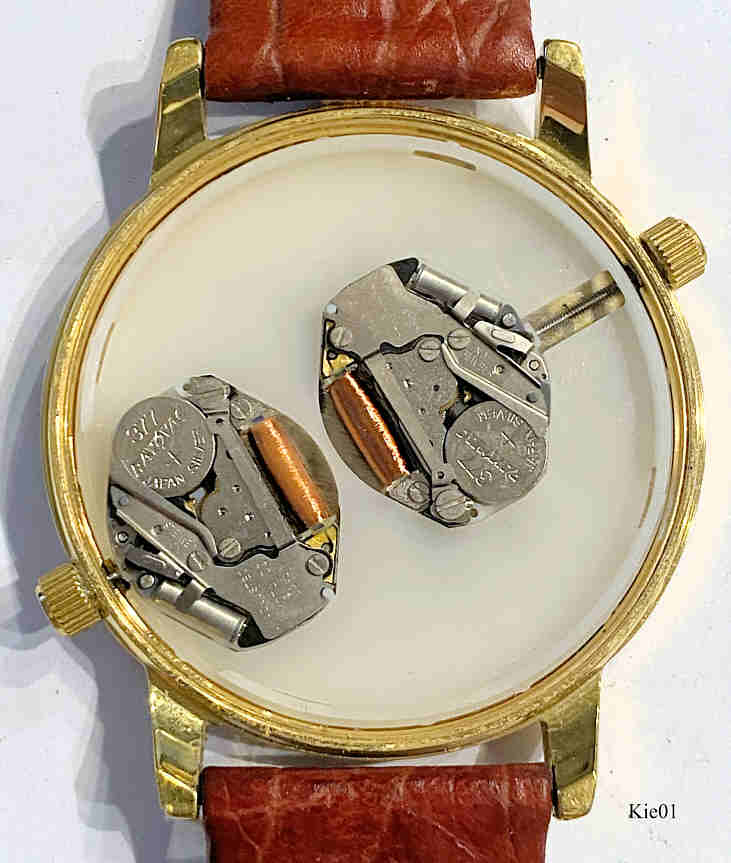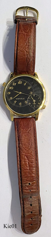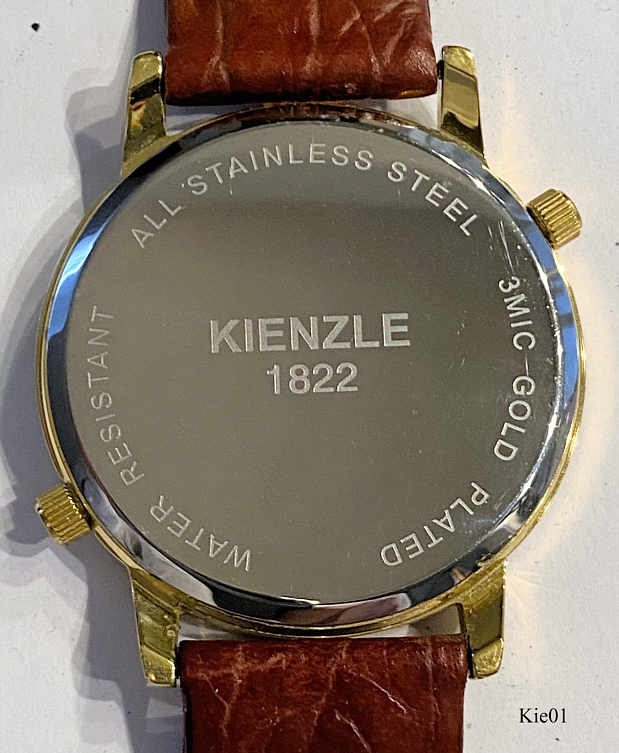 Eine Kienzle 1822 mit zwei Uhrwerken, damit kann man gleichzeitig zwei Zeitzonen im Blick behalten. Stainless Steel Gehäuse mit 3 Micron Goldauflage. Beschriftet vorn: ”Kienzle, 1822”, hinten: “All Stainless Steel, Water Resistant, 3 Mic Gold Plated, Kienzle, 1822”, innen 2x: “0 Jewels, Unadjusted, Miyota Co., Japan”.
