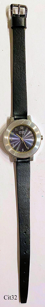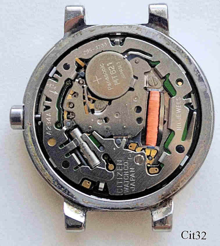 Dies ist eine Citizen Eco-Drive Uhr, Citizen Caliber A234A, Referenz Nr.: A234-H22498-Y0, Beschriftet vorn:”CITIZEN, Eco-Drive, Japan A234-N38715-Y”, Rückseite:”St.Steel, Citizen Watch Co, Water Resist, CITIZEN, Eco Drive, A234-H22498-Y0, 900056, GN-0-S, Japan->10”, innen: ”Citizen Watch Co., No Jewels, A234A, Japan, 295-3700” Edelstahl Gehäuse. Eco drive heißt, daß das Zifferblatt eine Photozelle ist und das Sonnenlicht in elektrische Energie umwandelt, die dann in einem Kondensator MT621 gespeichert wird.