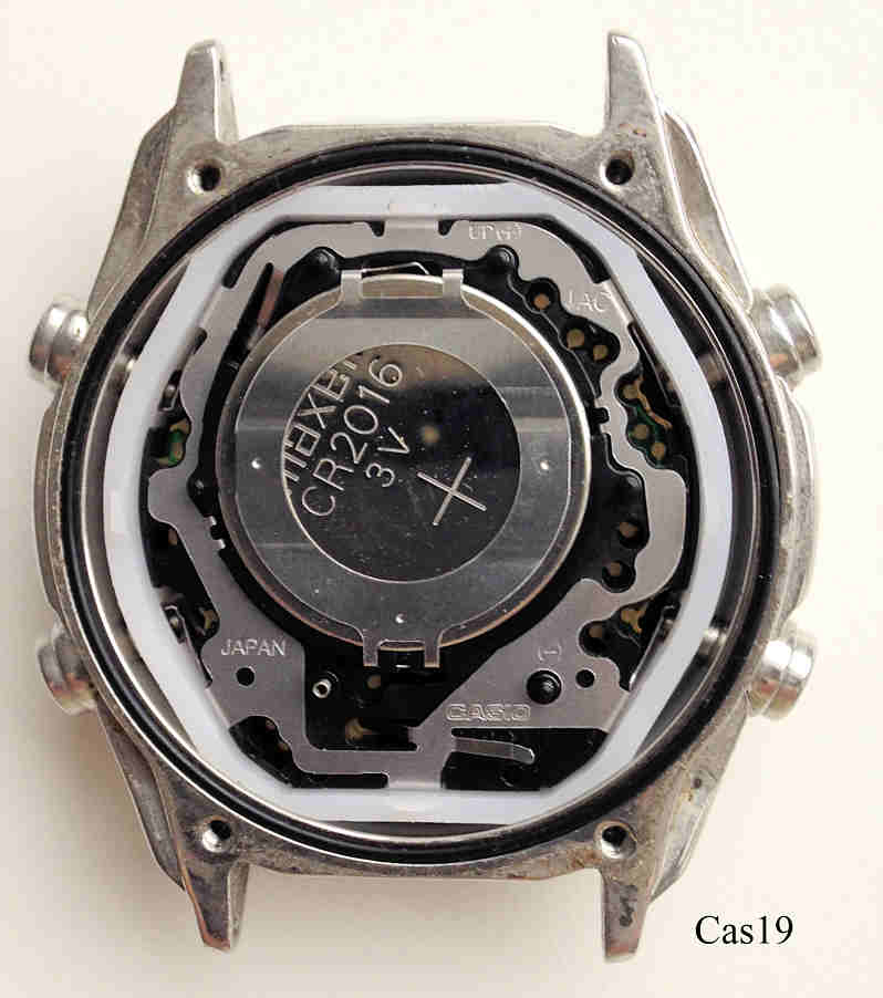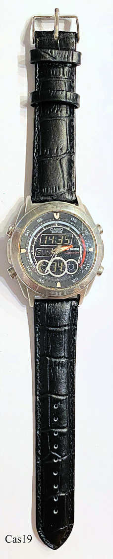 Ein moderner Ana-Digi Chronograph von Casio. Base Metal Gehäuse, Zeitanzeige oben, Sekunden unten, Wochentag bei der 9. Beschriftet vorn: ”Casio, Edifice, WR100M, Illuminator”, innen: ”Up(+), Casio, Japan, AC, (-)”, hinten: ”Casio, Edifice, World Time, Countdown Timer, 5 Alarm, Auto Light, 3181 EFA_115, Stainless Steel, Water Resistant 10 Bar, Japan Mov’t DY, Cased in China”.