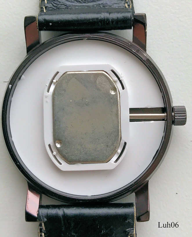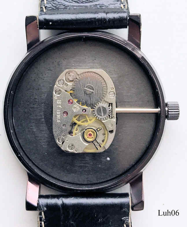 Eine Luch Einzeiger Handaufzugsuhr der Minsker Uhren-Manufaktur in Belarus. Schwarzes Zifferblatt mit weißen Ziffern. Kaliber 1301.1. Beschriftung vorn: ”LUCH, 15 Jewels, Belarus”, innen: ”Logo, BY 1301.1”, hinten: “225”. Schwarzes Lederarmband