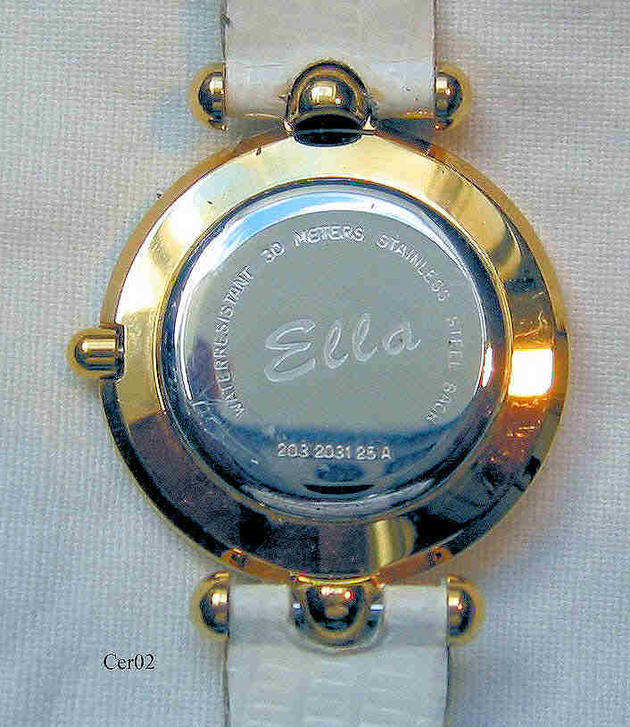 A Certina “Ella” ladies Dress watch with gold plated case and rosé/gold handpainted Rosenthal porcelain ring. The band is exchangeable in colors blue, green, white, orange and black. The dial is also made of porcelain, the back is stainless steel. Signed front: ”Certina, Swiss Made”, back: ”Waterresistant 30 meters, Ella, Stainless Steel back, 203 2031 25 A”. Caliber ETA 980.002
