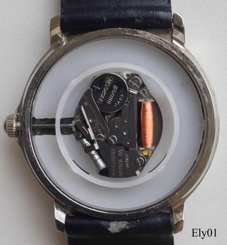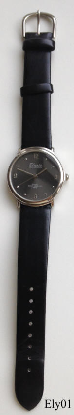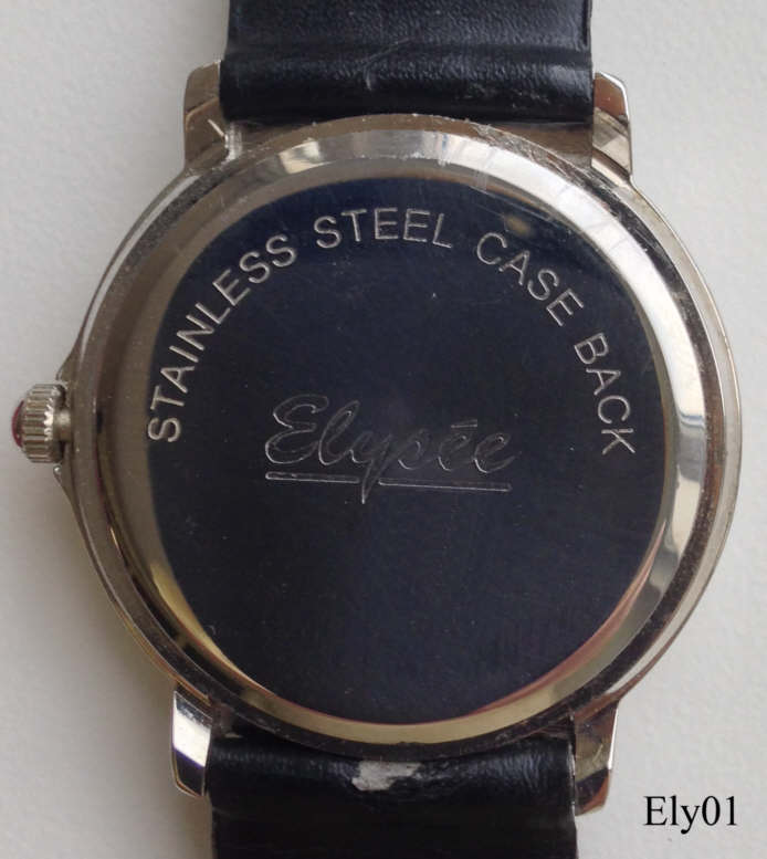 Eine einfache Quartzuhr von der Marke Elysée. Beschriftet vorn: “Elysée, Quartz, Water Resistant, 3ATM”, hinten: “Elysée, Stainless Steel Case Back”, innen: “Unadjusted, Miyota Co., Japan, No Jewels”. Schwarzes Lederarmband.