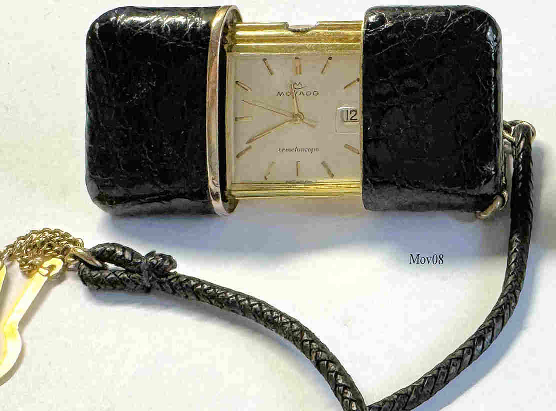 Eine Movado Ermetoscope Reiseuhr mit Handaufzugswerk, champagner farbenes Zifferblatt, Datum bei der 3 mit Linse. Die Uhr zieht sich automatisch auf wenn man die Gehäusehälften auseinander zieht. Bezeichnet vorn: ”Movado, Ermetoscope, Switzerland€¯”¯, innen: ” “¯, hinten: ”€¯Metal Dore, 101”€¯. Die Uhr befindet sich in einem Lederschuber. Die Uhr misst 50 x 35 mm im Schuber, 75 x 35 mm offen.. |