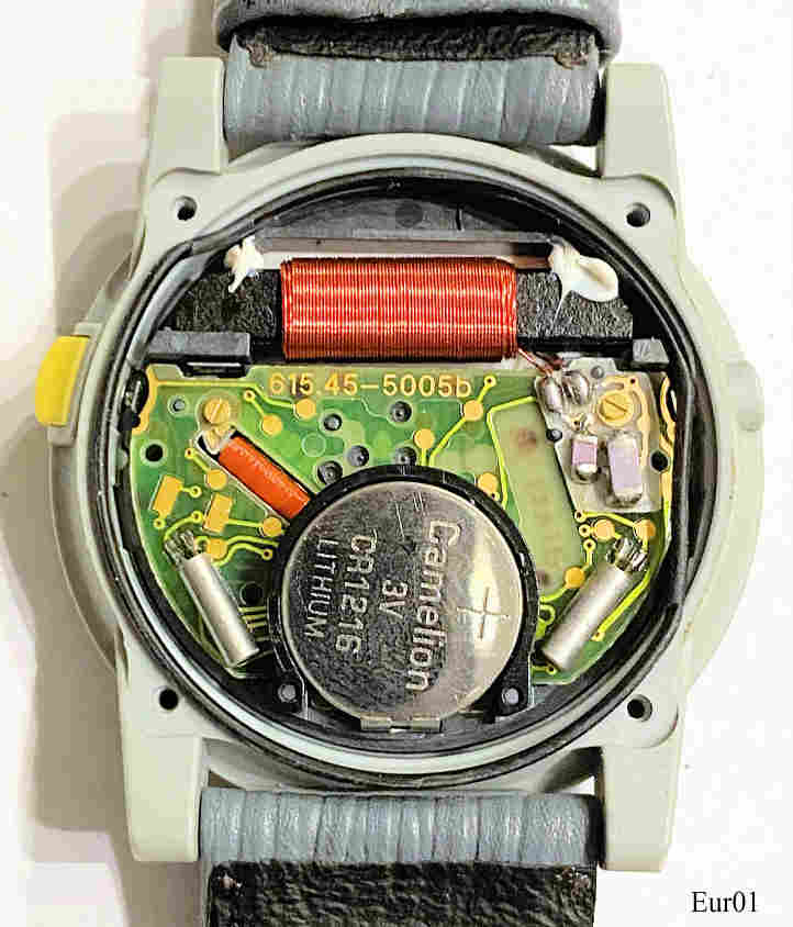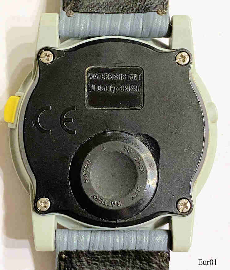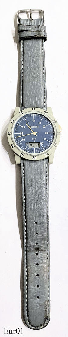 Eine Eurochron Funkuhr mit blauem Zifferblatt und weißen Ziffern. Graues Kunststoff-Gehäuse und schwarze Kunststoff Rückwand. Beschriftet: ”Eurochron” hinten: “CE, Water Resistant, Battery Type CR1220”. Tag/Datum Display bei der “6”, Kaliber Junghans 615.45-5005b