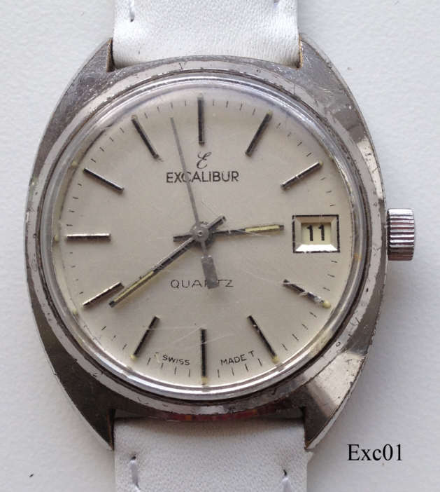 An Excalibur Quartz watch, one of the early analogue quartz watches. SSiH movement Caliber 5500, date at 3. Signed front: “Excalibur, Quartz, Swiss Made”, back: “Stainless Steel Back, Water Resistant, Swiss Made, 75215”, inside: “SSiH 5500, Unadjusted, Three 3 Jewels”. White Leather band.