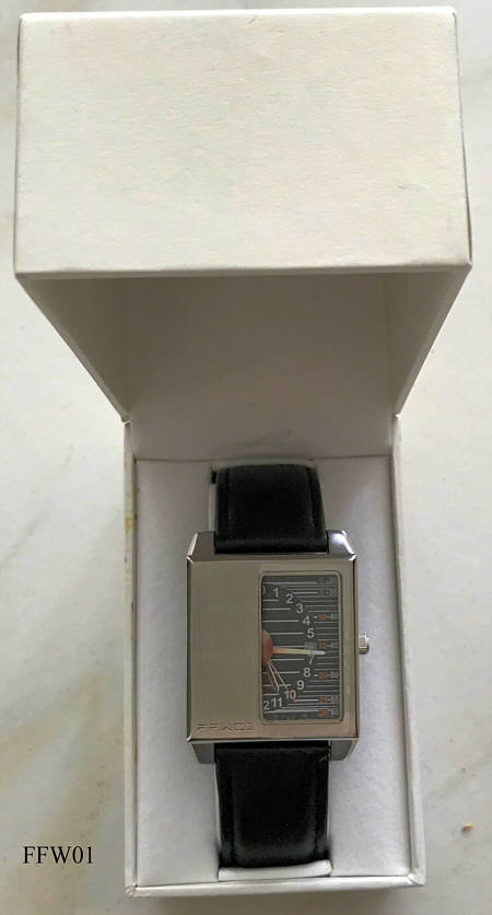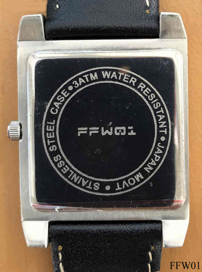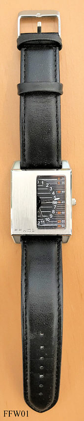 Eine einfache Quartzuhr mit einem interessanten Zifferblatt. Der kleine Zeiger zeigt die Stunden, der große die Minuten von 1 bis 30 wenn der Zeiger eine rote Spitze hat, und von 31 bis 59 wenn die Spitze weiß ist.. Das Gehäuse ist aus Edelstahl. Beschriftung vorn: ”FFW01 “€, innen: “6M12, Miyota Co., Unadjusted, No Jewels”, hinten: ”Stainless Steel case, 3 ATM Water Resistant, Japan MVMT, FFW01”€. Uhrwerk Kaliber Miyota 6M12, Schwarzes Lederarmband.