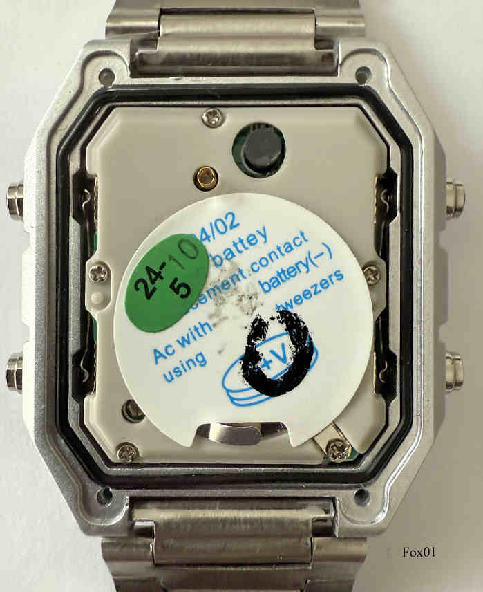 A Foxbox Ana-Digi-Temp watch, a sales brand of company Lige. This is obviously a copy of the Citizen Ana-Digi-Temp. Stailess steel case with stainless steel band. The watch has four display areas on the dial, Top left the time as analog display, right the analogue seconds display, down left the digital display, date and special functions like temparature, right the functions. Signed front: ”A1, Foxbox”, back: ”Foxbox, WR 30M, Stainless steel Back, Japan Movement, 3 ATM Water Resistant”, inside: ”explanaion to change the battery”.