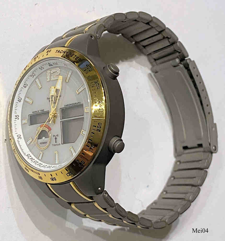 Eine sehr schöne Funk Solar Uhr der Firma Meister-Anker mit Analog und Digitalanzeige. Digitalanzeige zeigt die Weltzeiten, Chronographenfunktionen und Ladezustand. Ewiger Kalender, Weltzeit 38 Städte, Stoppuhr, Sleepfunktion, Überladeschutz, Dunkelgangreserve bis zu 6 Monate. Das Gehäuse ist aus Titan, Beschriftung vorn: “MA, Radio Controlled, Solar Drive, 5 Bar”, innen: ”RCW342, Artstar”, hinten: “Radio Controlled, Water Resistant, 5 Bar, Titanium, MA Titan, 90959/6, CE”. Titan Gliederarmband, Caliber W342.