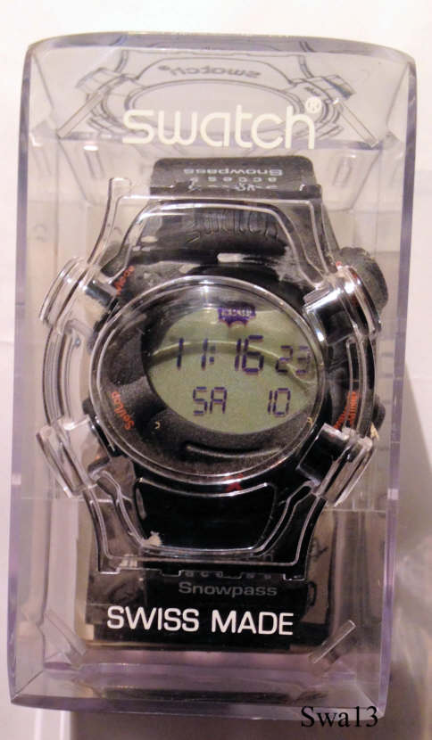 Eine Swatch Access LCD Digitaluhr, Modell “Garmisch Boarder X 2000” SXB100F, aus der Frühjahr/Sommer Kollektion 1999 mit Kunststoff Gehäuse. Beschriftet hinten: “E004175633, 5742, Swatch, 9383, Patented, Water Resistant, No (0) Jewels, Swiss made, V8, Battery CR1632, 16x3,2”, Kunststoff Armband mit Klettverschluß. Diese Uhr hat einen integrierten Microprozessor, der induktiv mit Daten geladen werden kann. Damit dient die Uhr als Zugangskontrolle in fast allen bekannten Skigebieten. Man hält nur die Uhr, nachdem sie am Ticketschalter geladen wurde, an den Zugangsautomaten und schon wird die Schranke geöffnet.
