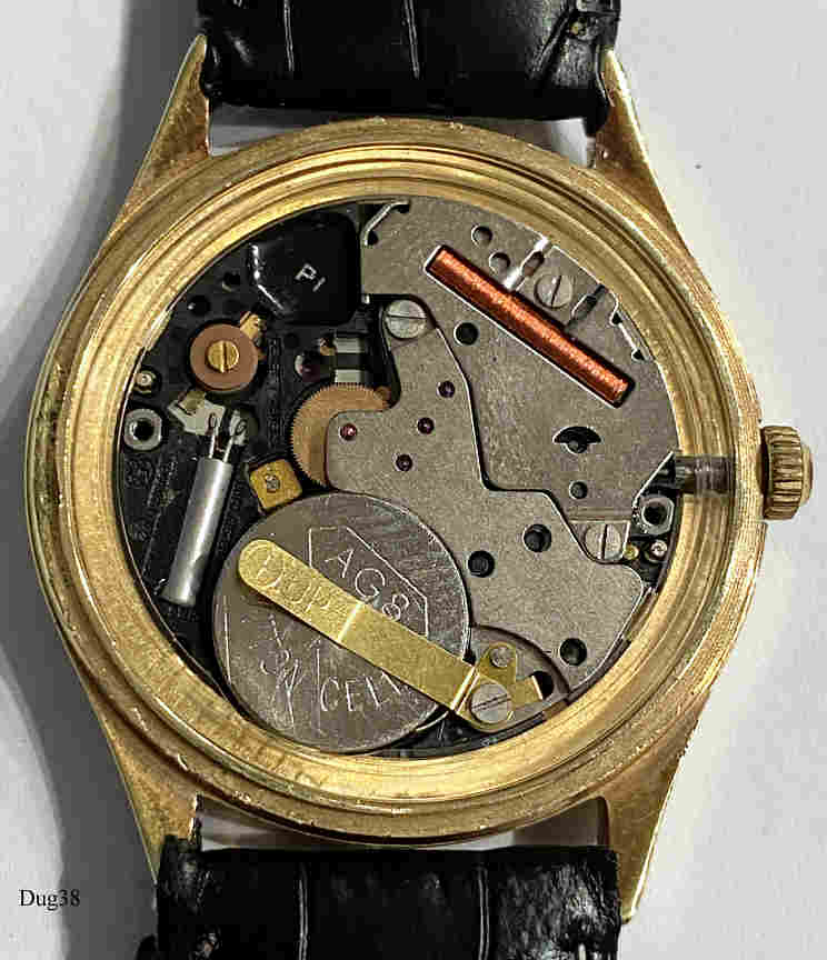 A Dugena mens Quartzwatch with gold plated case and Stainless Steel Back. Caliber ETA 944.111. Signed front: “Dugena, Quartz” back: ”891431, 205”, inside: ”944.111, seven 7 Jewels, Unadjusted”.
