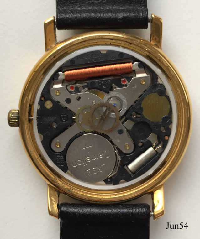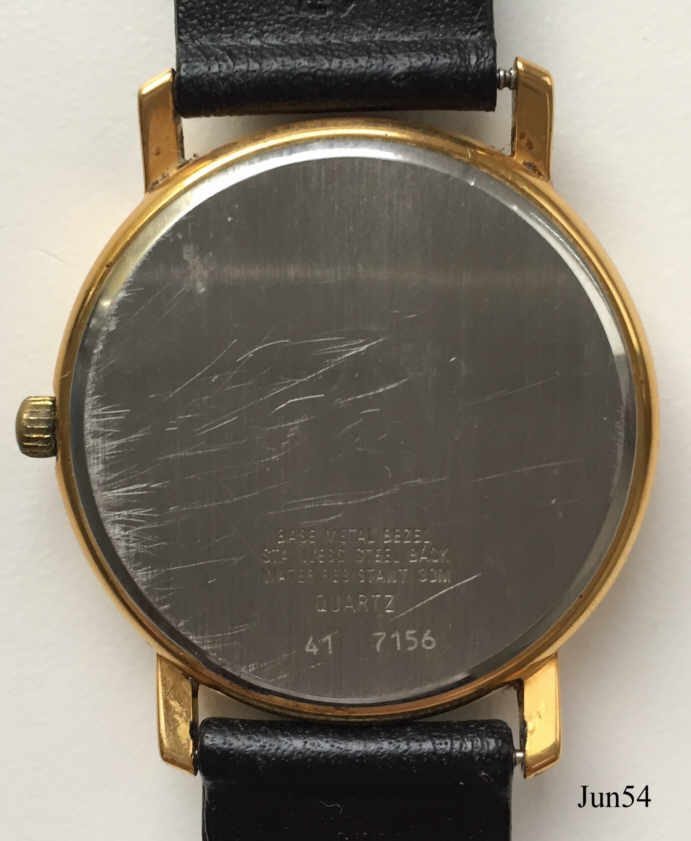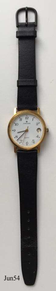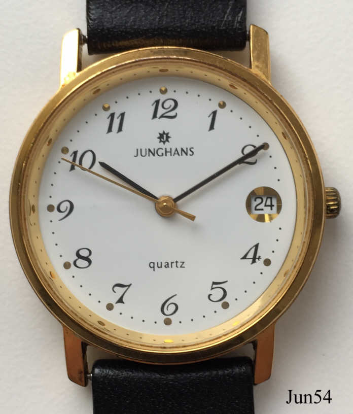 Eine elegante Junghans Quartz Herrenuhr mit weißem Zifferblatt und gold gerahmtem Kalender bei der 3. Inschrift vorn: ”JUNGHANS, Quartz”, hinten: ”Base Metal Bezel, Stainless Steel Back, Water Resistant 30M, 41/7156”, innen: ”ETA 450.111,V8, Swiss, No 0 Jewels, Unadjusted”. Schwarzes Leder Armband, Kaliber ETA 450.111