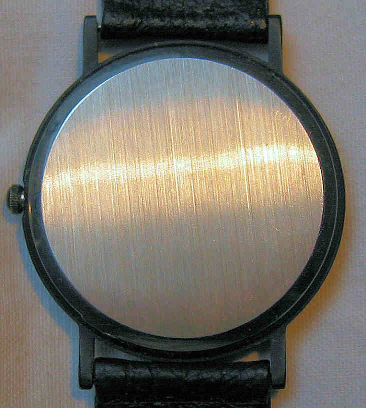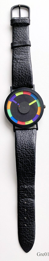 Eine ungewöhnliche Designuhr der Firma Greiner. Sekunden- und Stundenzeiger sind als Scheiben ausgeführt, der Minutenzeiger ist ein Zeiger. Beschriftung vorn: ”Greiner”, hinten: ” “ innen: ”9GB00, Akita LTD, Japan, Unadjusted, No Jewels”. Akita Quartz Uhrwerk, Kaliber 9GB00.