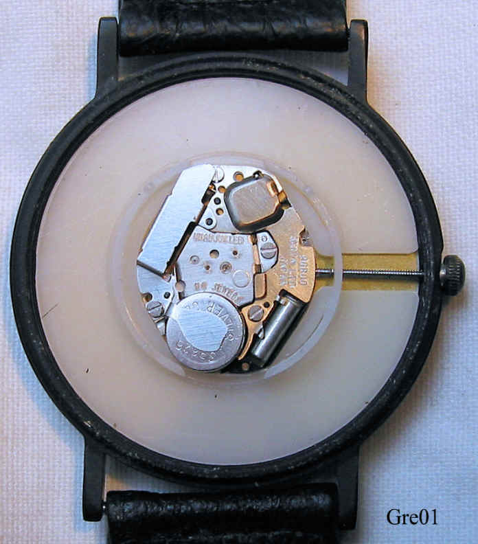 An unususal dress watch from Greiner, Seconds and hour are displayed by discs and the minute by a hand. Signed front: ”Greiner”, back: ” “, inside: ”9GB00, Akita LTD, Japan, Unadjusted, No Jewels”. Akita Quartz movement, caliber 9GB00.