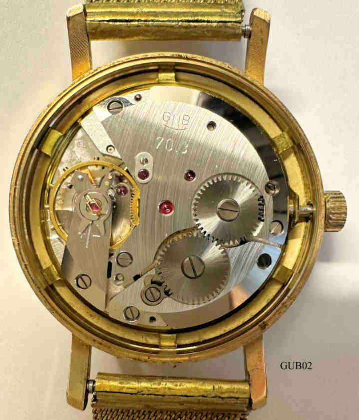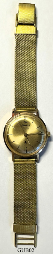 Ein Chronometer der Firma Glashütte Original aus DDR Produktion. Beschriftung: ”€Glashütte, 17 Rubis, Made in GDR”€ hinten: ”GUB, Edelstahlboden, Stoßgesichert, Plaque 20 Mikrometer, Wasser Geschützt, Made in Germany, 495390, Chronometer Staatlich geprüft”€, innen: ”GUB, 70.3”€. Vergoldetes Mesch Armband. Diese Chronometer wurden auch über Westdeutsche Versandhäuser, z.B. Quelle, vertrieben.