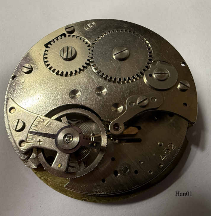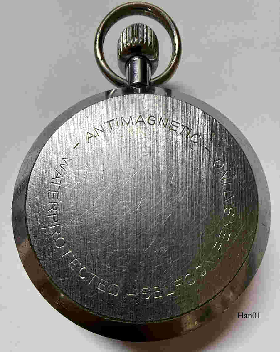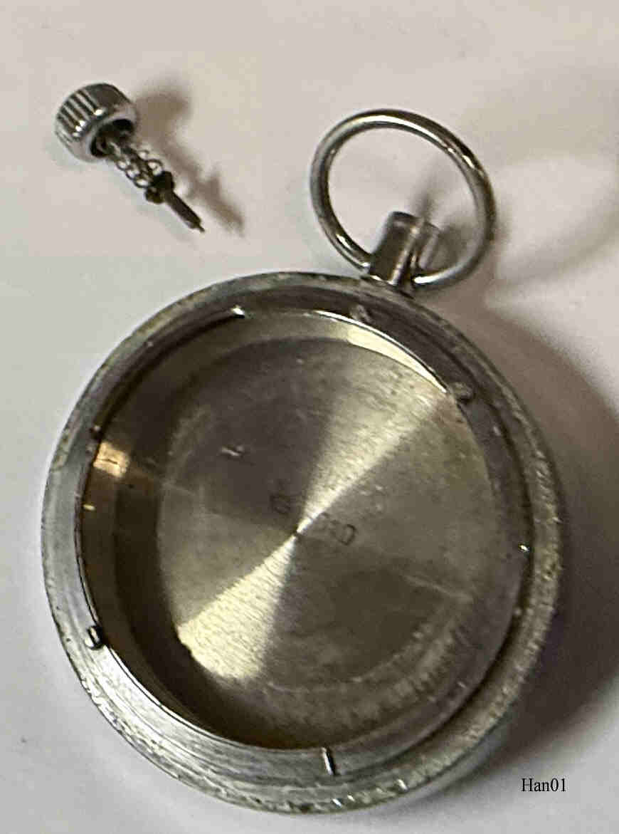 Eine Hanhart Stoppuhr mit silbernem Gehäuse. Beschriftung vorn: ”Hanhart,3 Jewels, Shockproof”€¯, innen: ”€¯452”€¯. Kaliber Hanhart 452