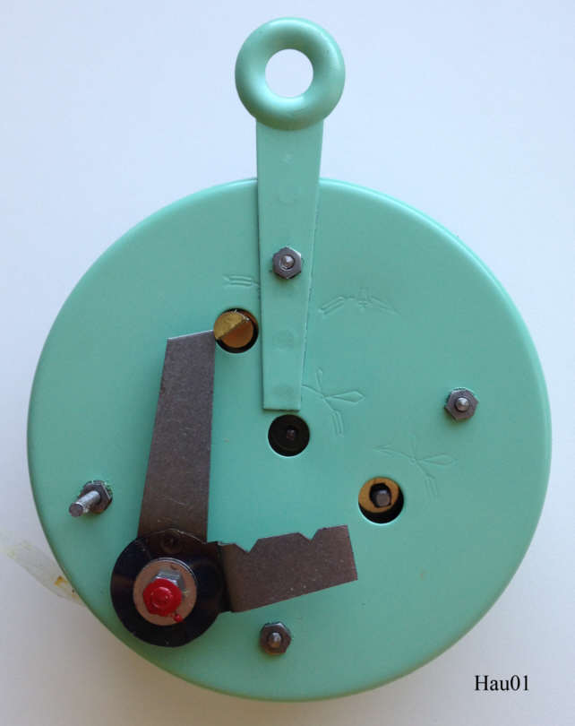 A slightly modified Alarmclock to be used for desinformation during war times. The clock is tied to a gas baloon with the green hole and the package with the relevant material is hung from the L shaped bar in the back of the clock. When the adjusted flight time is over the bar is disengaged and the packet is falling down in the calculated area. The clock is manufactured on behalf of the german Bundeswehr at Gebr. Hauser in Villingen Schwenningen around 1960. |