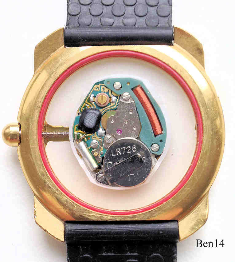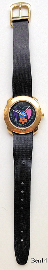 Eine Benetton by Bulova, Beschriftet vorn: ”Benetton Colors Dress You, Benetton by Bulova,”, hinten: ”United Colors of Benetton by Bulova, Stainless Steel Back, Water Resistant, Base Metal Bezel, Mod. Dep.”, innen: ”562.001”, schwarzes Plastikarmband mit Benetton Schließe.