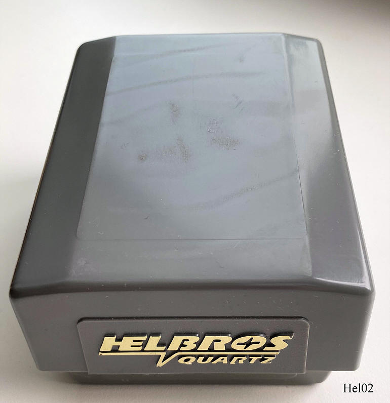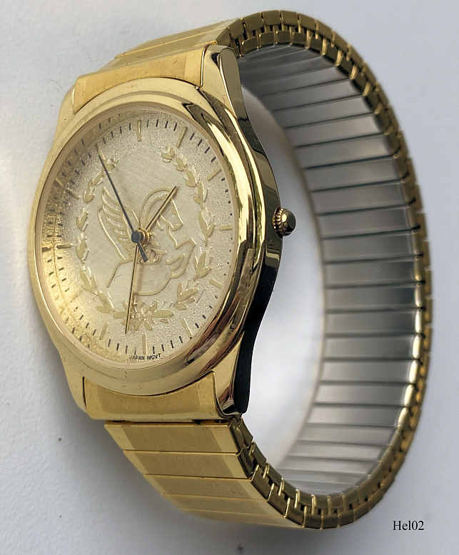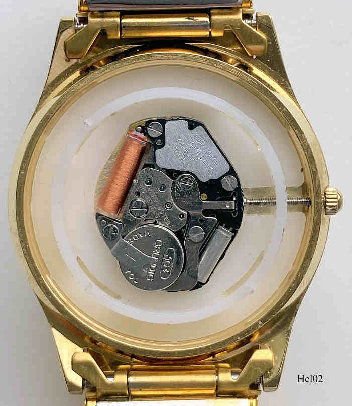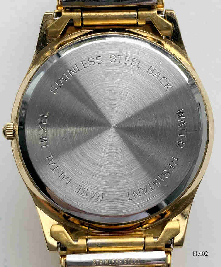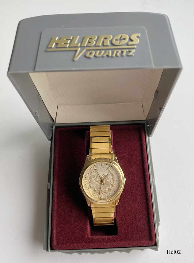 Eine Werbeuhr der Firma Readers Digest von Helbros. Beschriftet vorn: keine Beschriftung, nur das Logo von Readers Digest im Kranz, hinten: ”Stainless Steel Back, Base Metal Bezel, Water Resistant”, innen: “Morioka Tokai, Y481F, Japan”. Dazu passendes Flex Armband im Goldton