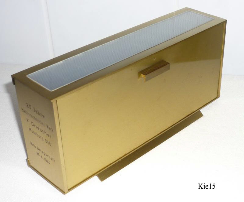 Ein Kienzle Heliomat Schreibtischuhr, die weltweit erste Uhr mit Solarantrieb, im Handel seit 1963. Schweres Messing Gehäuse mit weißem Zifferblatt. Oben über die ganze Fläche befindet sich die Selen Solarzelle. Beschriftet vorn: “Kienzle, Heliomat”, hinten: “ “, seitlich: “25 Jahre, ElektrotechnischesWerk, F. Driescher, Moosburg Obb., Ihre Belegschaft, 25.04.1964”, innen: “Kienzle, Germany, Eleven (11) Jewels, Unadjusted”. Als Accu fand ein DEAC 451D Verwendung