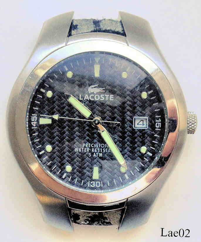 Dies ist eine Herrenuhr von Lacoste mit schwarzem Carbon Zifferblatt. Beschriftet vorn: ”Lacoste, Precision, WaterResistant, 5 ATM”, hinten:” Stainless Steel, Registered Model, Water Resistant 5 ATM , Lacoste, 3510G”, innen: “6M12, Miyota, unadjusted, No Jewels”.
