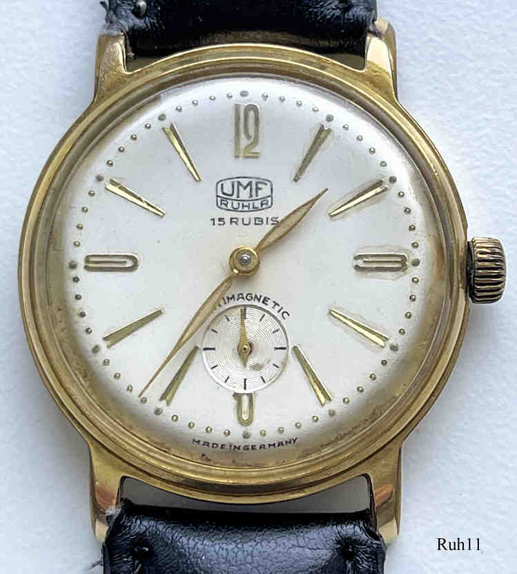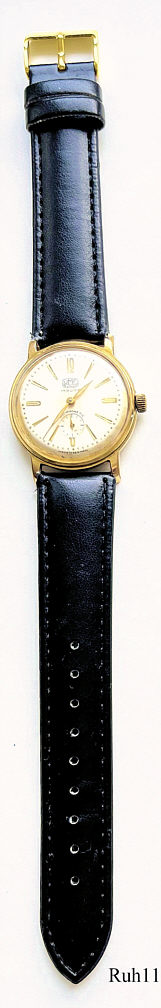 Eine Ruhla Handaufzugs Herrenuhr mit vergoldetem Gehäuse und Stainless Steel Back, eine Uhr aus der Ruhla UMF Manufaktur. Beschriftung vorn: ”€œUMF, Ruhla, 15 Rubis, Antimagnetic” hinten: ”Wassergeschützt, Plaque 20 Micron, Edelstahlboden”, innen: ”€œE490 “€. Uhrwerk UMF E490, Schwarzes Leder Band