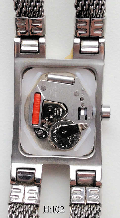 Eine Designuhr der Modefirma Tommy Hilfiger. Die Uhr hat die Form des H von Hilfiger und ein geteiltes Edelstahl Milanaise Armband. Beschriftung vorn: “Tommy Hilfiger”, hinten: “F80132, Water resistant 3 ATM, 100% Stainless Steel”, innen: “Ronda, one 1 Jewel, Swiss Parts, Thailand Made, 762”. Kaliber Ronda 762.