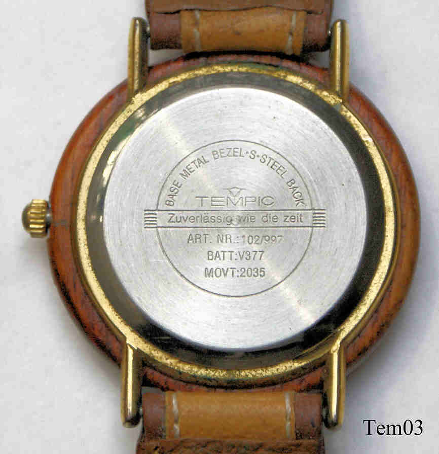 Dies ist eine Damen Holzuhr von Tempic mit Holz Zifferblatt. Beschriftet vorn: ”Tempic, Quartz”, hinten: ”Base Metal Bezel, s. Steel Back, Tempic, Zuverlässig wie die Zeit, Art. Nr.: 102/997, Batt.: 377, Movt.: 2035”, innen: ”Unadjusted, Miyota Co., Japan, No 0 Jewels”