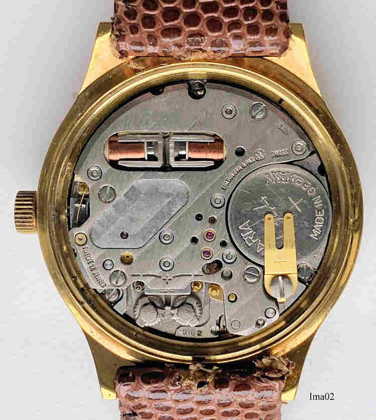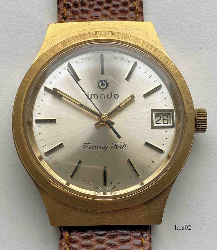 Dies ist eine Imado Stimmgabeluhr, ESA 9162, Base Metall Gehäuse, stainless steel back, Kalender bei der 3. Bezeichnung auf dem Zifferblatt: ”Imado, Geneve, Tuning Fork, Swiss Made”, In der Rückwand: ”Imado, Stainless Steel Back, Base Metal Bezel, Water Resistant, 121 202086”, innen: “Twelve 12 Jewels, Lic. Bulova & Pat. ESA Swiss”.