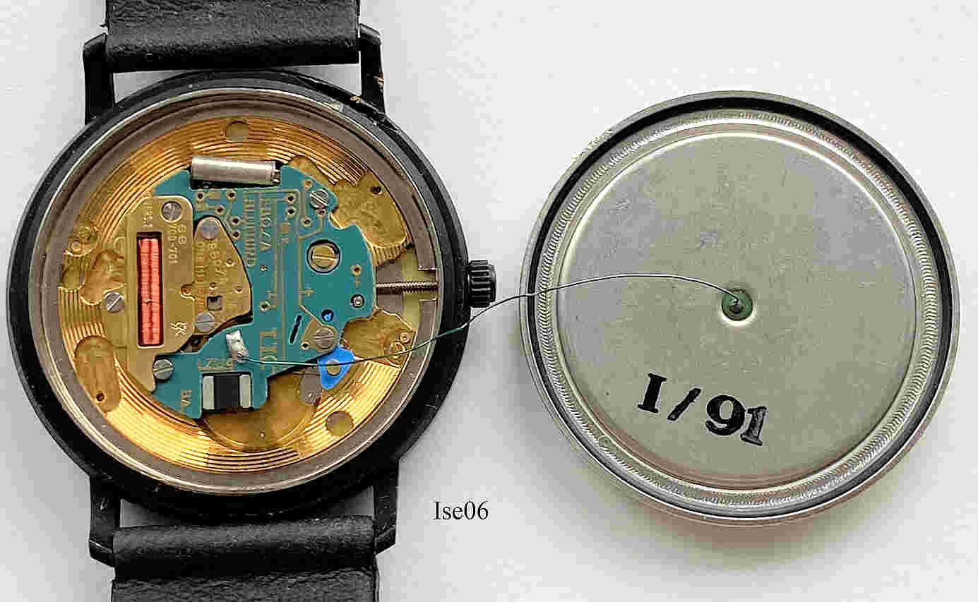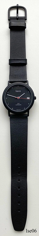 Eine Iseco Uhr mit klarem schwarzem Zifferblatt, Datum bei der 3. Beschriftet vorn: ”Iseco, TTC, Longlife, Germany”, hinten: “Stainless Steel Back, Water resistant 3 ATM, TTC Longlife”, innen: “EBOSA Bluebird, Ebosa S.A. One 1 Jewel, CE, 700.701, Vers.2, LZU4”. Longlife bezieht sich auf die Lithium Jod Batterie, die die Uhr Garantiert 20 Jahre antreiben soll. Die ganze Rückwand ist die Batterie. Kaliber Ebosa LZU4.