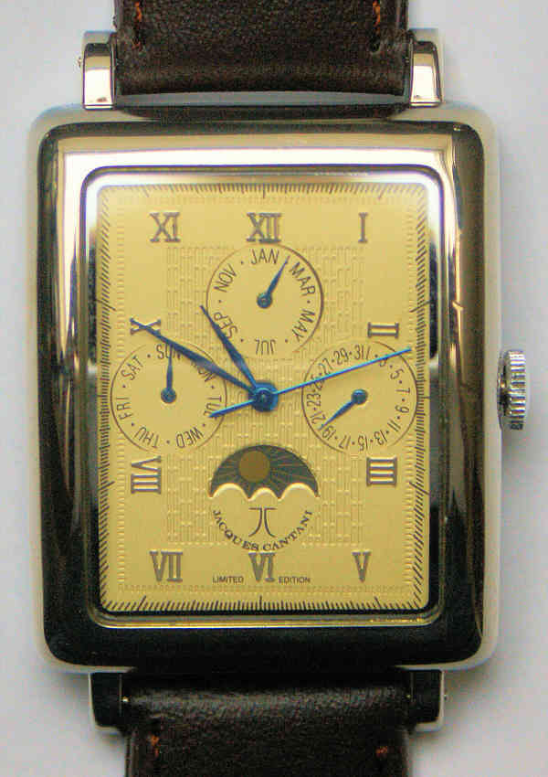 Eine sehr schöne Quartzuhr von Jacques Cantani mit Kalender und Mondphase. Edelstahl Gehäuse mit braunem Lederarmband. Beschriftet vorn: “Jacques Cantani, Limited Edition”€, Rückseite: “Jacques Cantani, Stainless Steel Back, Sapphire cutting glass, Water Resistant, Limited Edition, JC400, Artefakt, AT0114”€, innen: “S.Epson Corp., Japan, VX3F”€.