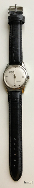 A handwind watch of the indian brand hmt. Stainless Steel case and screw-on back, white dial with letters at 3, 6, 9 and 12, black leather band. Signed front: ”hmt, Janata, 17 Jewels, Para Shock, 17 Jewels, Made in India, 0231”, back: ”Stainless Steel, Shock Resistant, Water Dust Protected, hmt, WET, 417048”, inside: ”hmt, 17J”.